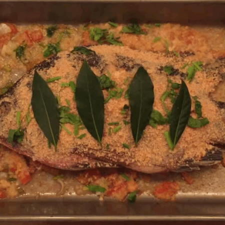 A media cocción se riega el besugo con el caldo de cocción para que resulte más jugoso.