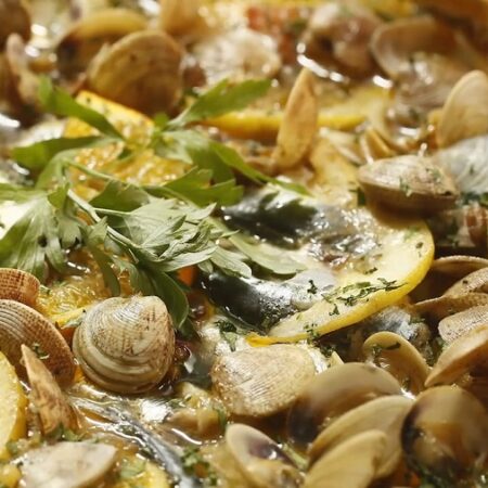 - Se colocan encima las almejas y, entre ellas, las rodajas de limón y de naranja.