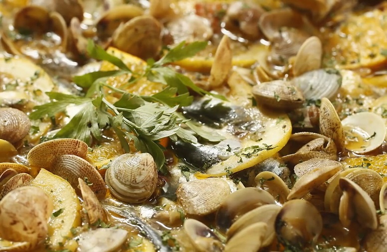 - Se colocan encima las almejas y, entre ellas, las rodajas de limón y de naranja.