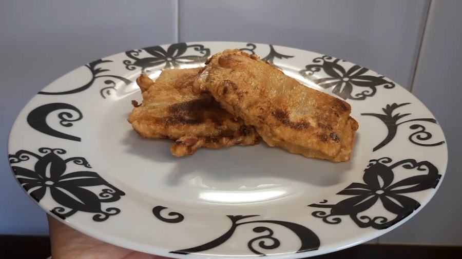- Cuando espese, se agregan 4 yemas de huevo y se salpimenta. Con una cuchara se extiende un poco de bechamel sobre una penca, se cubre con otra penca y así sucesivamente hasta rellenarlas todas. Se pasan con mucho cuidado por harina y huevo, y se fríen en abundante aceite.